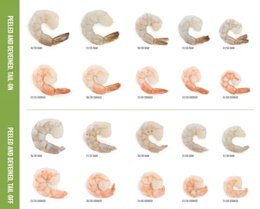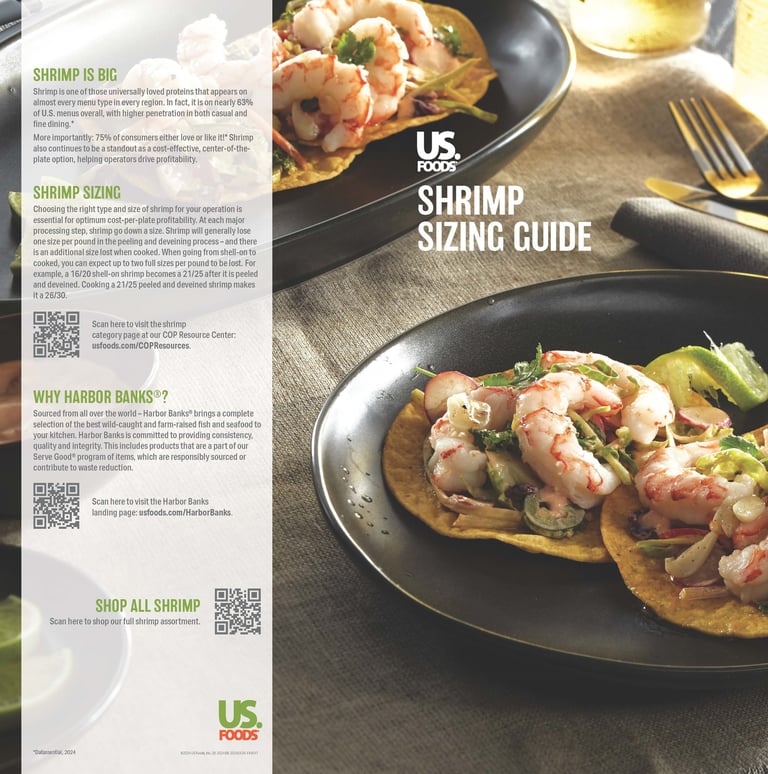 In 2024, US Foods prepared to feature their Harbor Banks shrimp brand at prospecting events. The marketing team requested a laminated sizing guide for chefs to use during live cooking demos. The guide needed to visually compare raw vs. cooked shrimp, allowing chefs to place shrimp samples directly on the poster for accurate, real-time size reference.