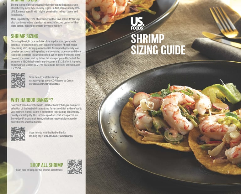 In 2024, US Foods prepared to feature their Harbor Banks shrimp brand at prospecting events. The marketing team requested a laminated sizing guide for chefs to use during live cooking demos. The guide needed to visually compare raw vs. cooked shrimp, allowing chefs to place shrimp samples directly on the poster for accurate, real-time size reference.