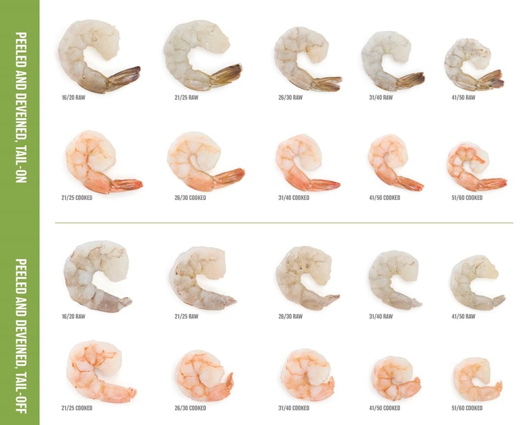 I redesigned the guide on a 17×17 format to accommodate all shrimp sizes, brand elements, and explanatory text without compromising clarity. I organized the shrimp illustrations so that raw and cooked sizes were clearly correlated, and separated “tail on” from “tail off” sizes to create a logical, easy-to-read structure. I communicated with the marketing team to show how the updated layout improved usability and readability while maintaining brand standards, addressing their concerns about cost and ensuring everyone understood the reasoning behind the design choices.